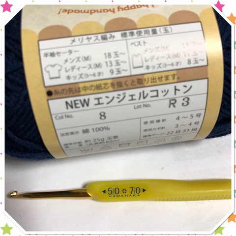 使用カギ針3~4号←大きめに仕上げたいので5号を使っています。
